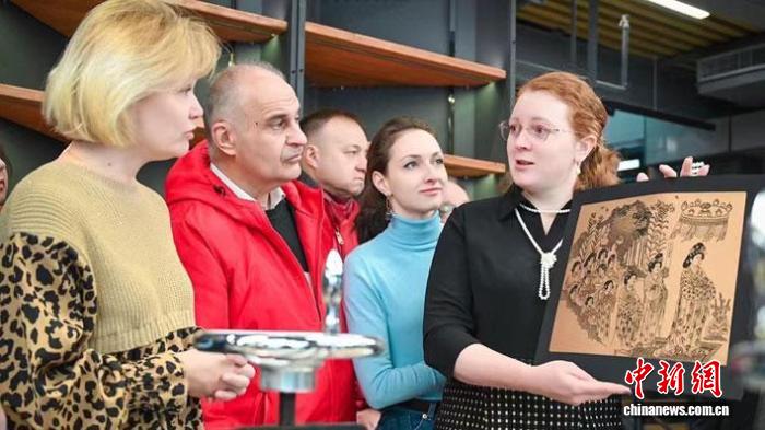 图为俄罗斯专家奥利亚(右)向外国专家介绍敦煌文化。 (资料图)敦煌市委宣传部供图