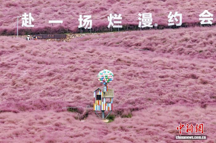 10月17日,航拍南京唐山矿山公园,粉色的小草如烟似雾,呈现出浪漫的粉色颜色。 (无人机拍摄)中新网记者 杨波 摄